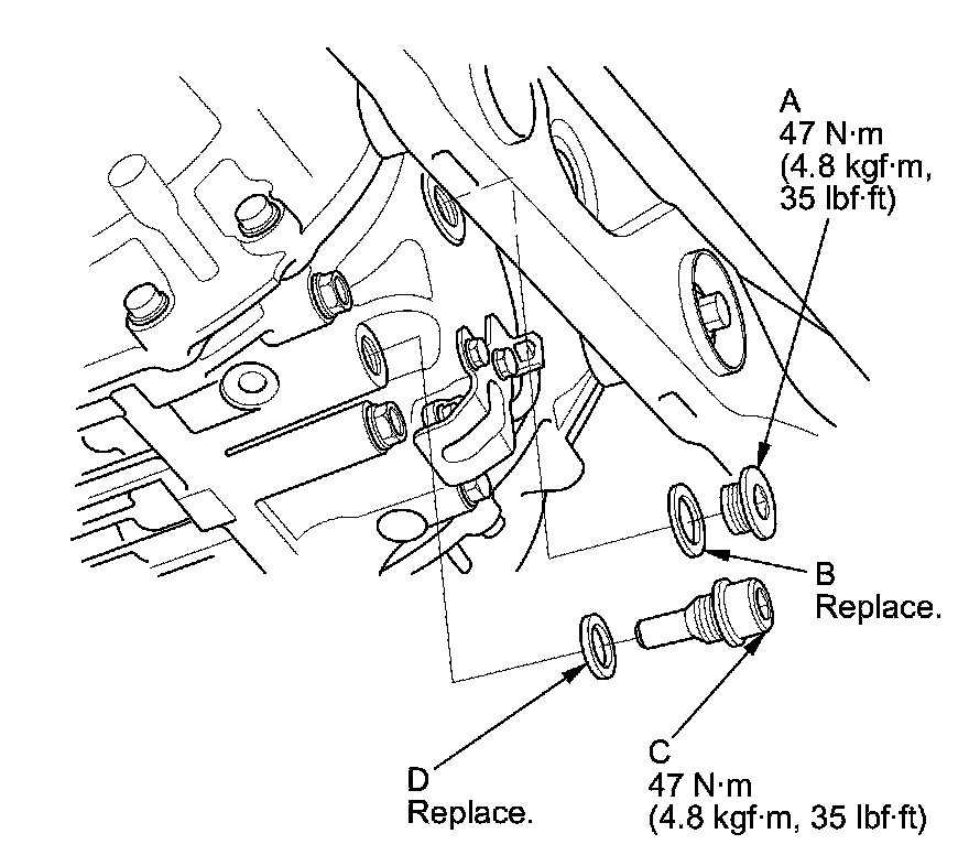 3. Remove the drain plug (C) and the sealing washer (D), and drain the fluid.