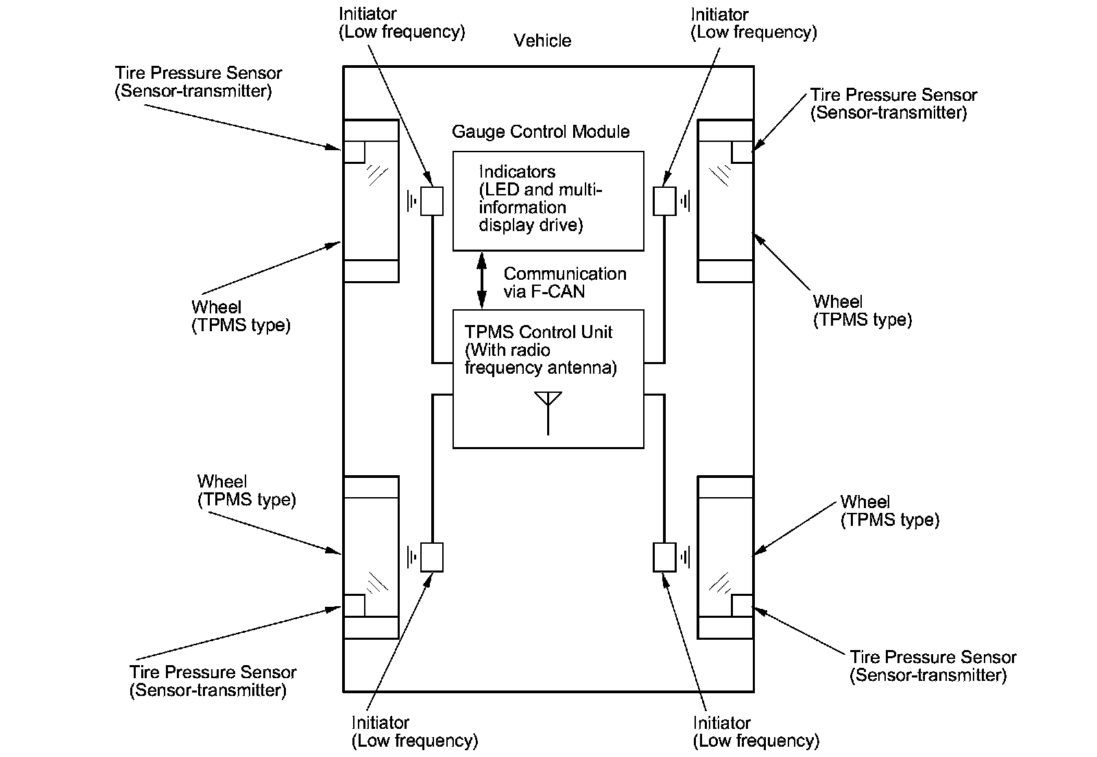 All indicators are in the gauge control module: The low tire pressure indicator (LED indicator), the four tire indicators (on the multi-information display) to show which tire is affected, and the TPMS indicator (on the multi-information display) that comes on only if there's a problem with the system. The message indicator (LED indicator) comes on when there is one or more indicators on in the multi-information display. When two or more tire pressures are low, the low tire pressure indicator comes on about 5 seconds before the appropriate tire indicator. Once low pressure is detected, the system scans all four tire pressure sensors to ensure that it turns on the correct tire indicator.