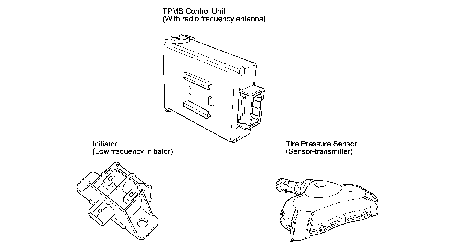 Mounted on top of the brake pedal support member, the TPMS control unit sends signals to the initiators and receives signals from the tire pressure sensor to verify pressure sensor IDs every time the ignition switch is turned ON (II), or the engine start/stop button is pressed to select the ON mode. It also receives signals from the transmitters for tire pressure and the sensor condition, and it continuously monitors and controls the system.