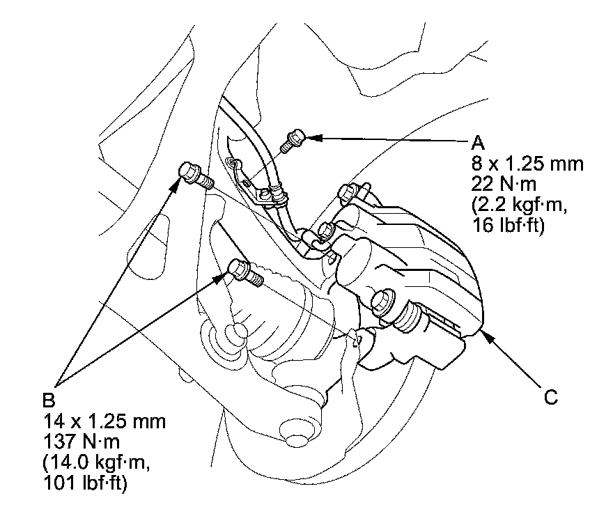 4. Remove the brake caliper bracket mounting bolts (B), then remove the caliper assembly (C) from the knuckle. To prevent damage to the caliper assembly or the brake hose, use a short piece of wire to hang the caliper assembly from the undercarriage. Do not twist the brake hose excessively.