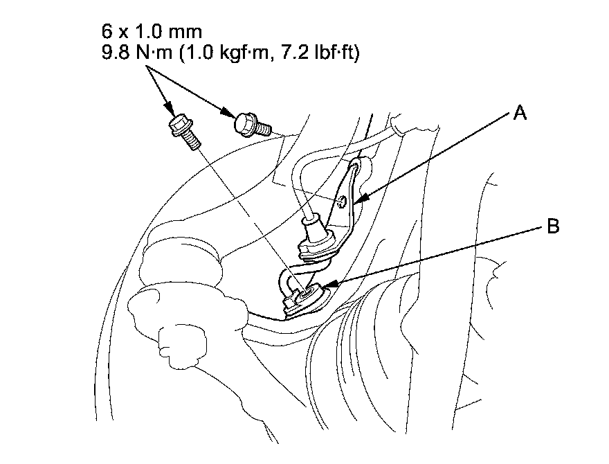 5. Remove the wheel speed sensor harness bracket (A) and the wheel speed sensor (B) from the knuckle. Do not disconnect the wheel speed sensor connector.