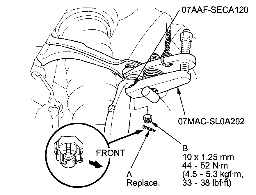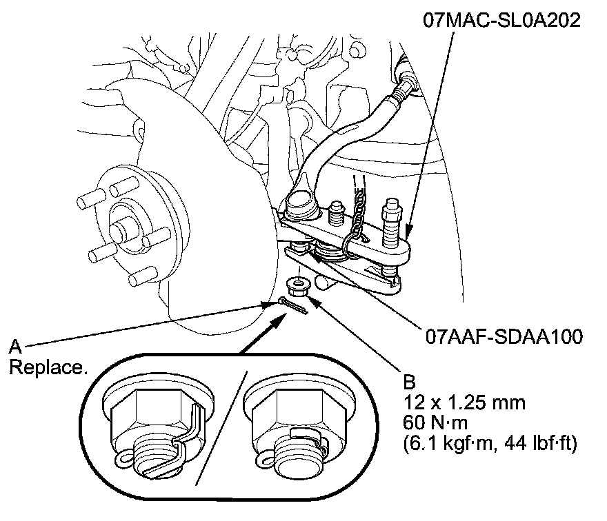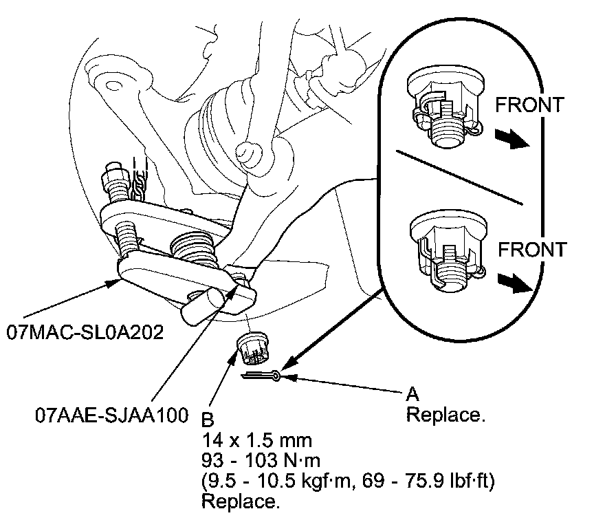 - First install all of the components, and lightly tighten the bolts and the nuts, then raise the suspension to load it with the vehicle's weight before fully tightening to the specified torque. Do not place the jack against the ball joint pin of the knuckle.