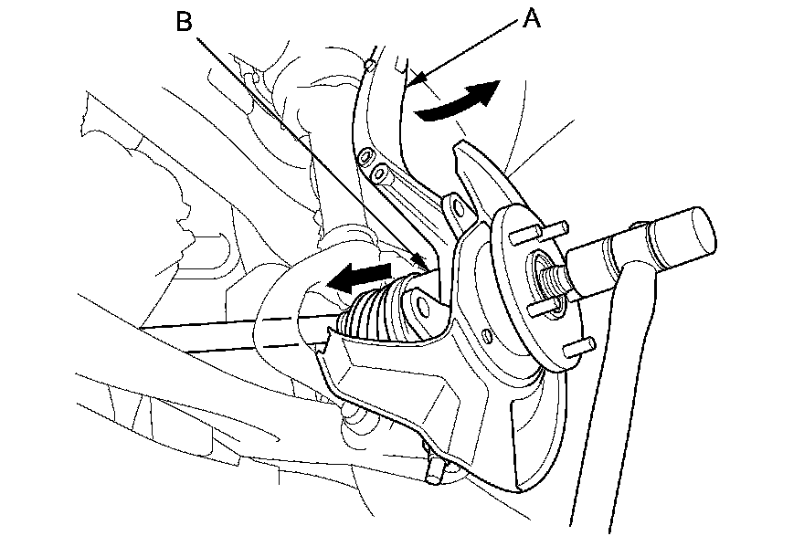 15. Pull the knuckle (A) outward, and separate the outboard joint (B) from the front hub using a soft face hammer, then remove the knuckle/hub.