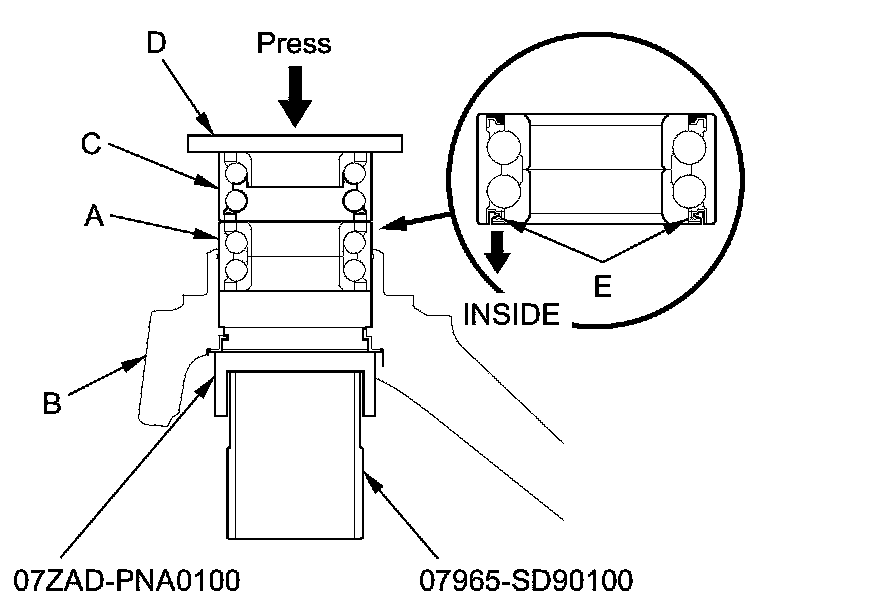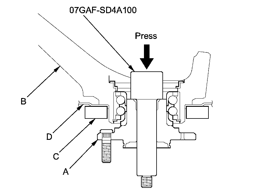 7. Press a new wheel bearing (A) into the knuckle (B) using the old bearing (C), a steel plate (D), the attachment, the support base, and a press.