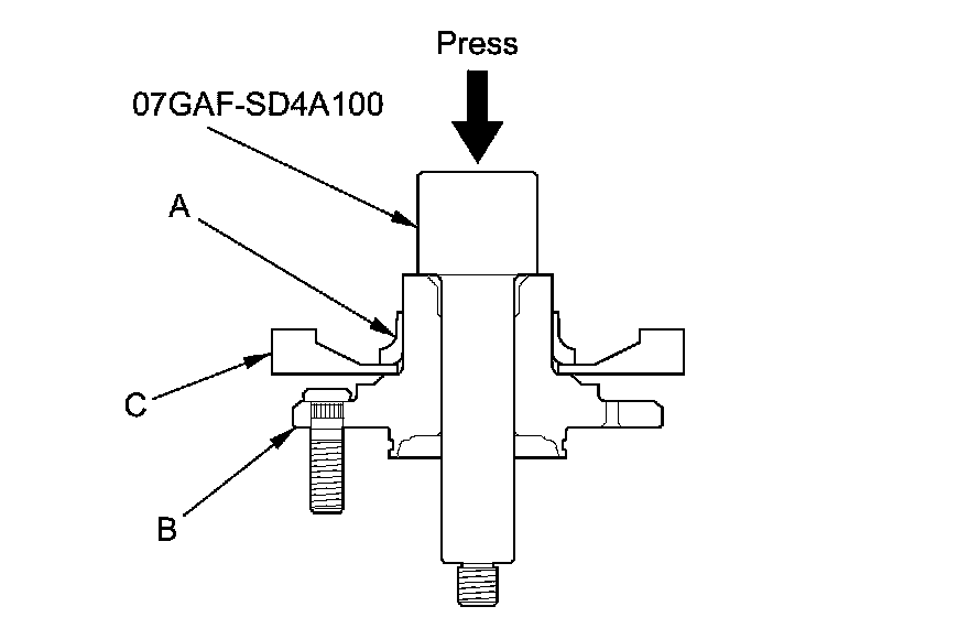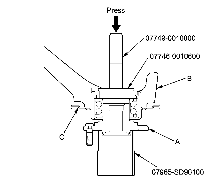 11. Install the hub (A) onto the knuckle (B) using the attachment, the driver handle, the support base, and a hydraulic press. Be careful not to damage the splash guard (C).