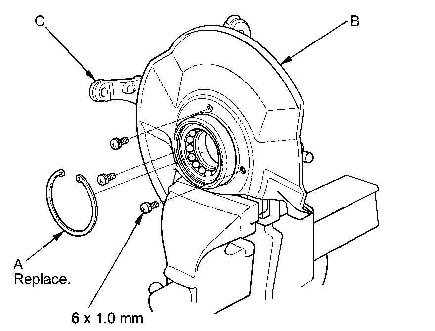 4. Remove the snap ring (A) and the splash guard (B) from the knuckle (C).