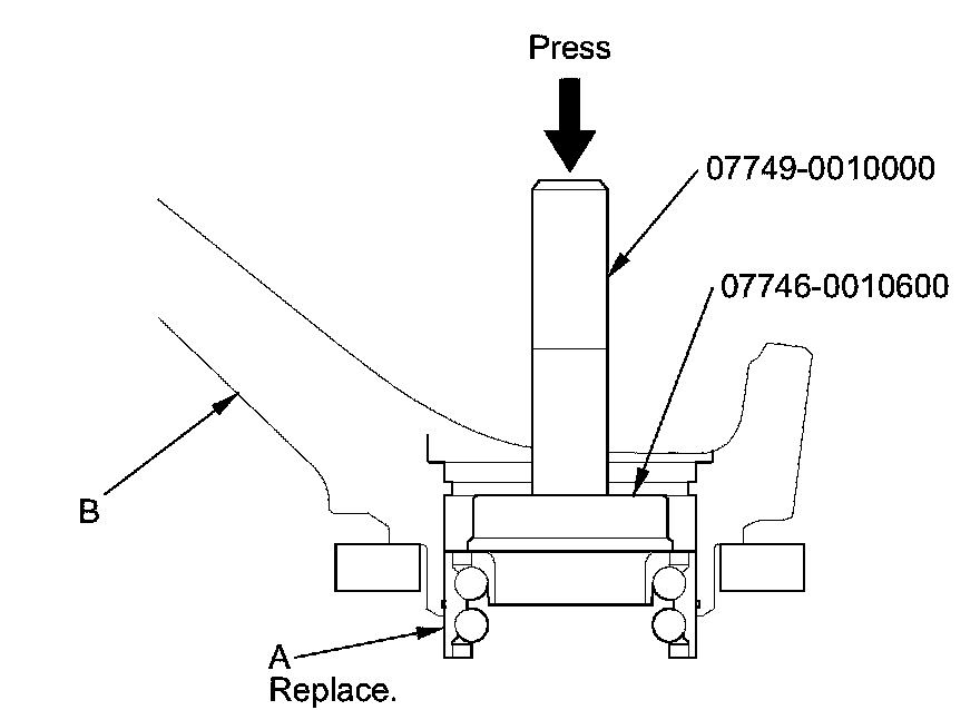 5. Press the wheel bearing (A) out of the knuckle (B) using the attachment, the driver handle, and a press.