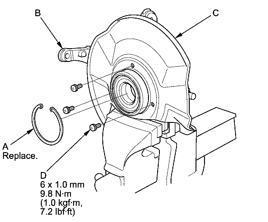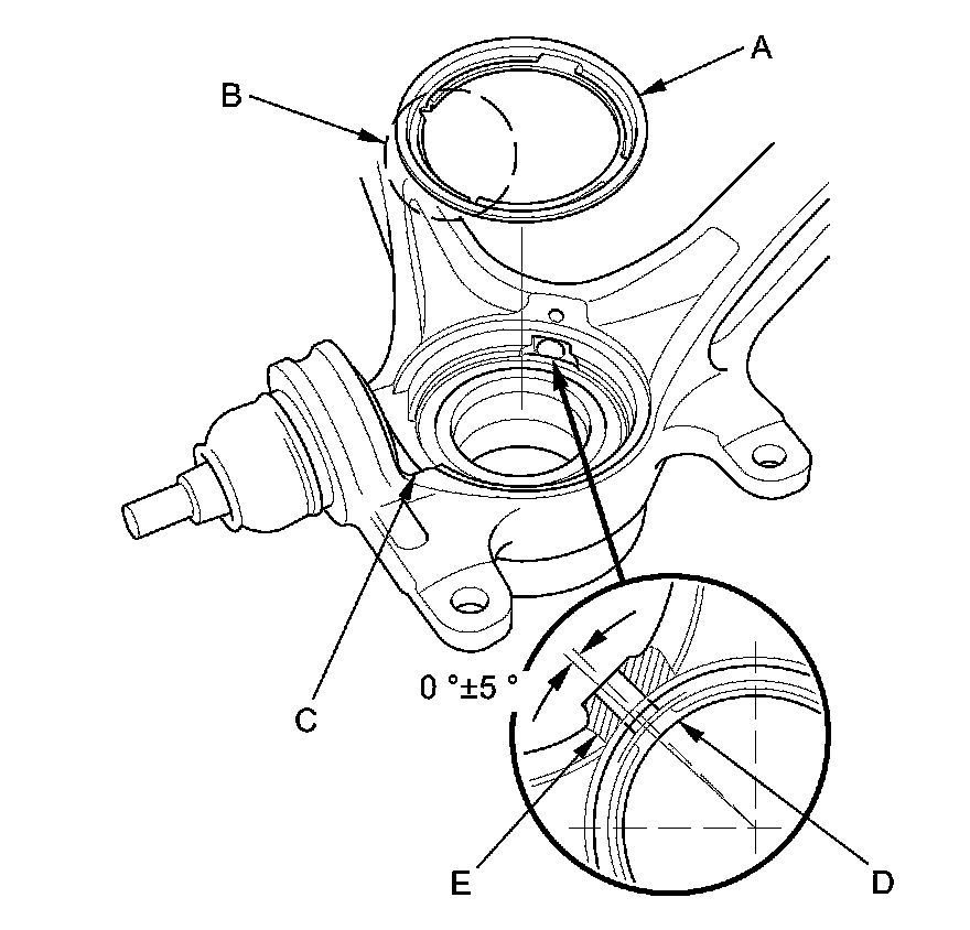 NOTE: When installing the new front knuckle ring, position the knuckle ring notch portion (B) toward the cut out (C) near the ball joint in the knuckle, and align the center of the knuckle ring ledge portion (D) with the center of the wheel speed sensor hole (E) on the knuckle as shown.