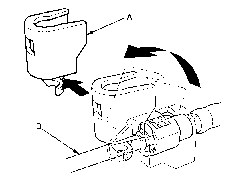 1. If equipped, remove the quick-connect fitting cover from the fuel line. Raise the cover (A) from the fuel line (B), and remove it as shown.
