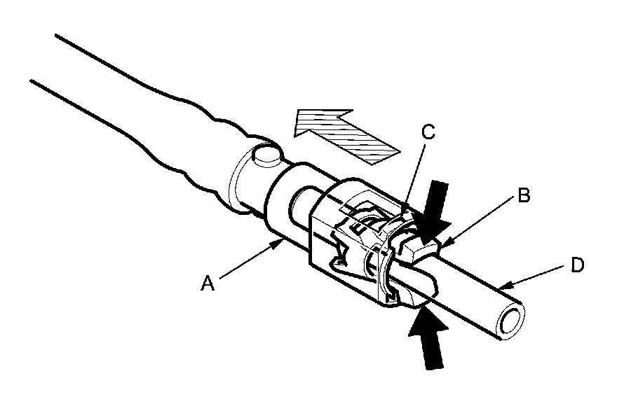 4. Place a rag or a shop towel over the quick-connect fitting. Hold the connector (A) with one hand, and squeeze the retainer tabs (B) with the other hand to release them from the locking tabs (C). Pull the connector off.