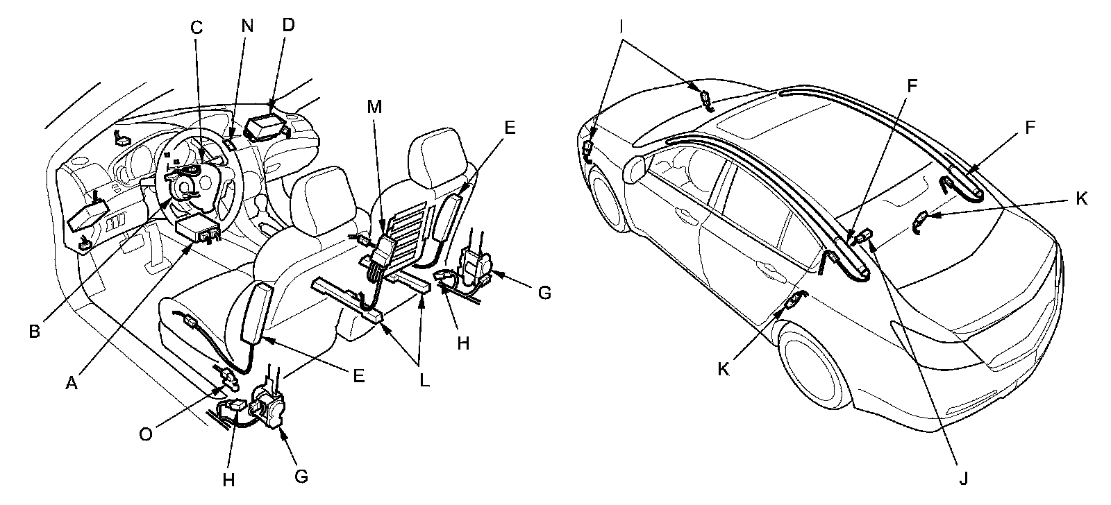 The SRS is a safety device which, when used with the seat belt, is designed to help protect the driver and front passenger in a frontal impact exceeding a certain set limit. The system consists of the SRS unit including safing sensor and impact sensor (A), the cable reel (B), the driver's airbag (C), the front passenger's airbag (D), side airbags (E), side curtain airbags (F), seat belt tensioners (G), side impact sensors (first) (H), front impact sensors (I), rear safing sensor (J), and side impact sensors (second) (K).