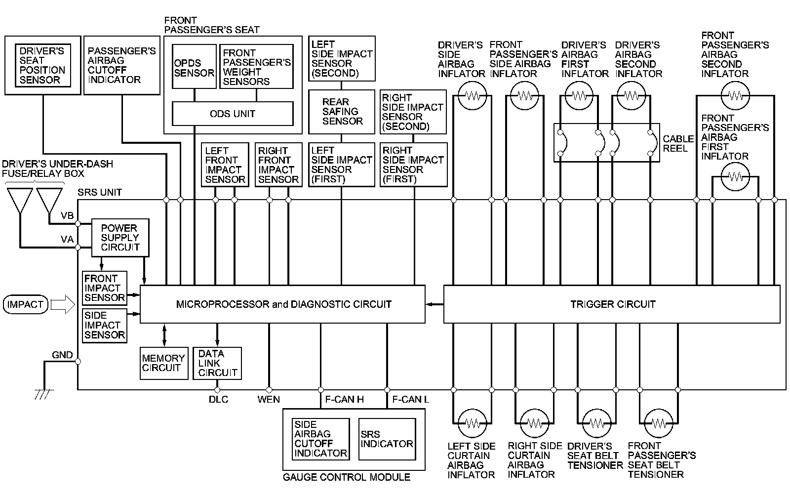 The main circuit in the SRS unit senses and analyzes the force of impact and, if necessary, ignites the inflator charges. If battery voltage is too low or power is disconnected due to the impact, the voltage regulator and the back-up power circuit will keep voltage at a constant level.