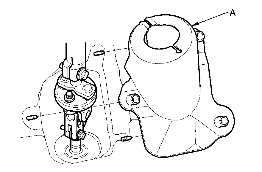 15. Remove the harness clamp (A), then remove the engine mount control solenoid valve bracket from the rear cylinder head; use the bracket bolt hole to attach the 2008 V6 attachment arm.