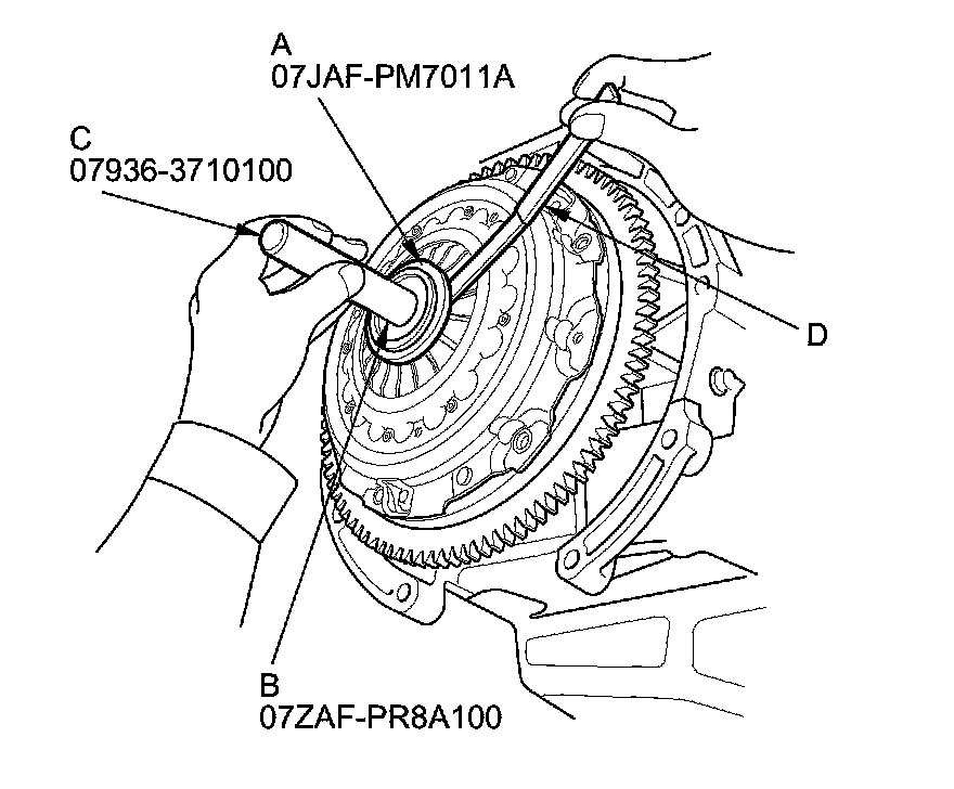 2. Check the evenness of the height of the diaphragm spring fingers using the clutch alignment disc (A), the clutch alignment shaft (B), the remover handle (C), and a feeler gauge (D). If the height difference is more than the service limit, replace the pressure plate.