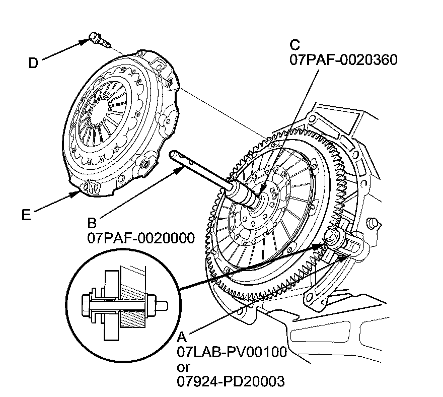 4. To prevent warping, loosen the pressure plate mounting bolts (D) in a crisscross pattern in several steps, then remove the pressure plate (E).