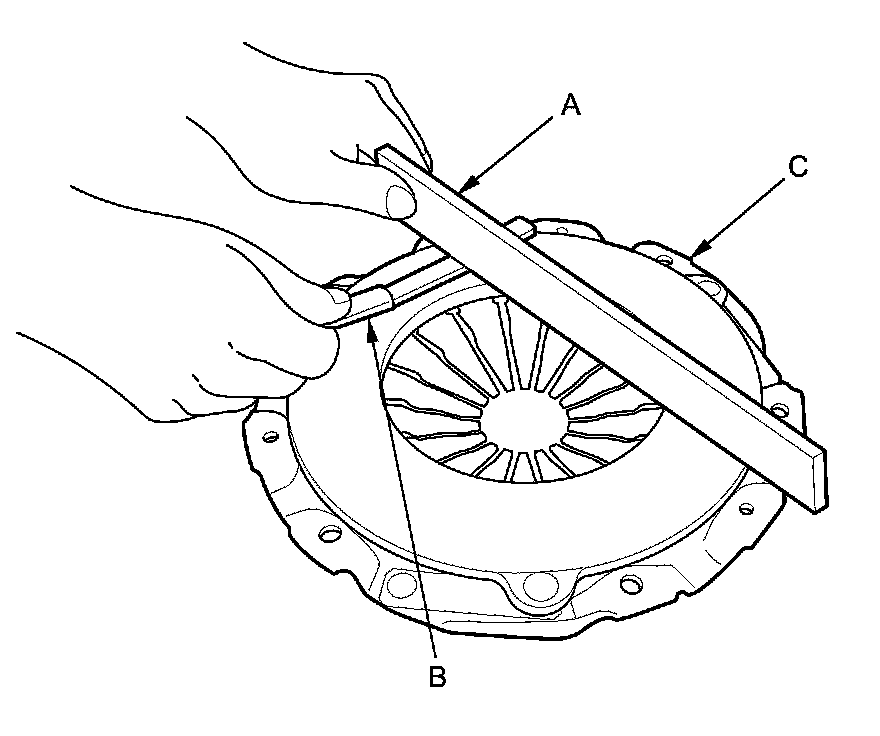 7. Inspect for warpage using a straight edge (A) and a feeler gauge (B). Measure across the pressure plate (C). If the most measurement difference is more than the service limit, replace the pressure plate.
