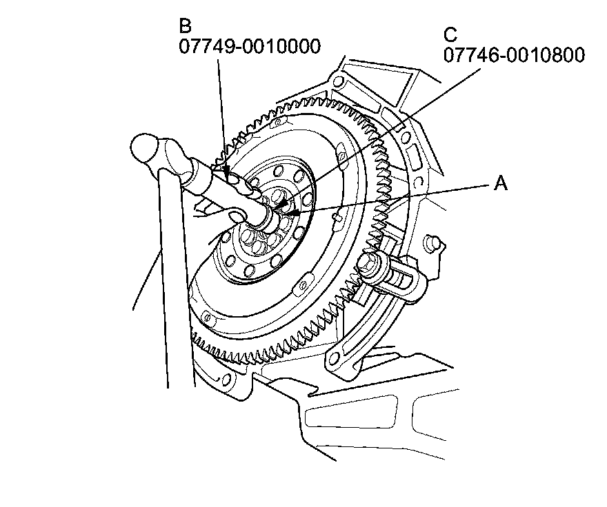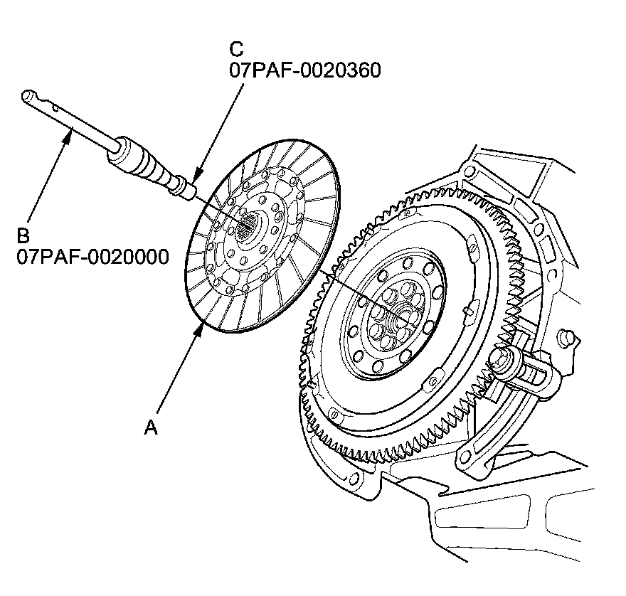 8. Remove the clutch disc (A), the clutch alignment tool set (B), and the 20 mm clutch alignment pilot (C).