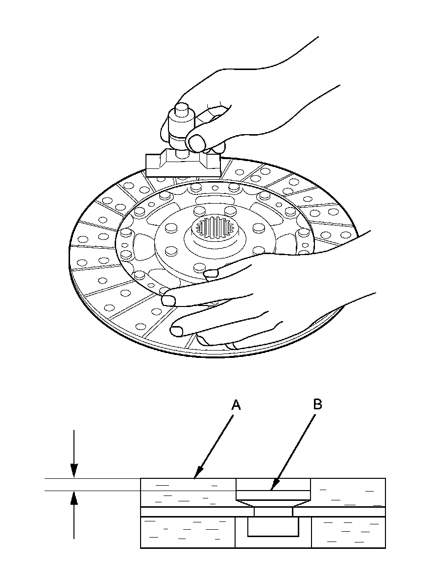 11. Measure the depths of the rivets from the clutch disc lining surface (A) to the rivets (B) on both sides. If the measurement is less than the service limit, replace the clutch disc.