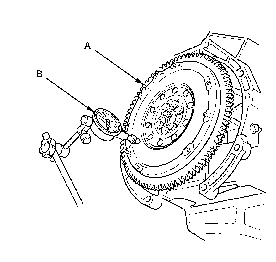 15. Measure the flywheel (A) runout using a dial indicator (B). Through at least two full turns with pushing against the flywheel each time you turn it to take up the crankshaft thrust washer clearance. If the measurement is not within the standard, replace the flywheel, and recheck the runout; go to step 16.