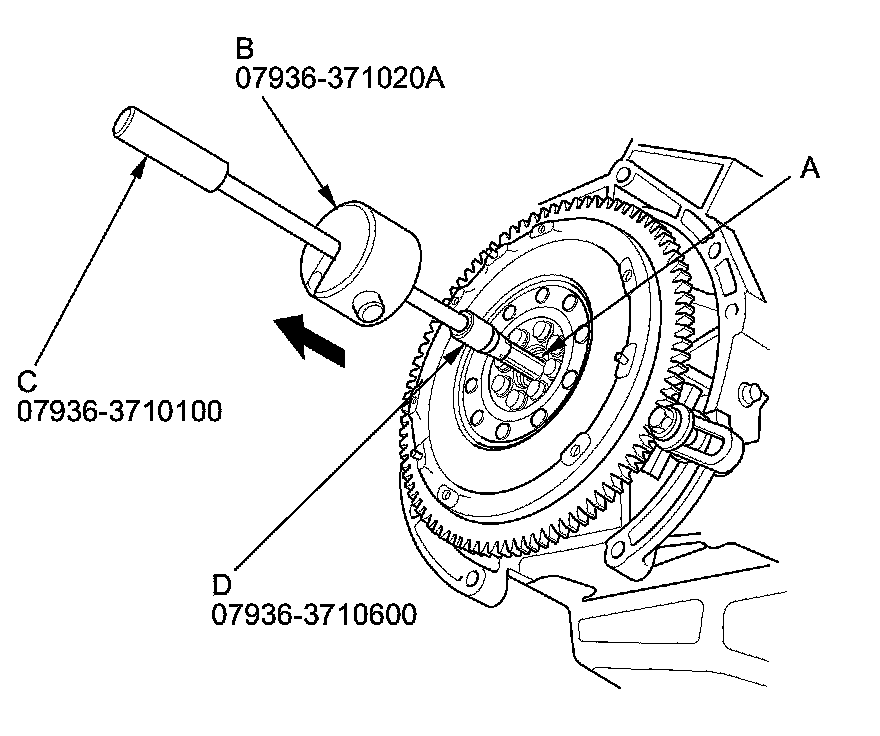 21. Remove the pilot bearing (A) using the slide hammer (B), the remover handle (C), and the 20 mm bearing remover shaft set (D).