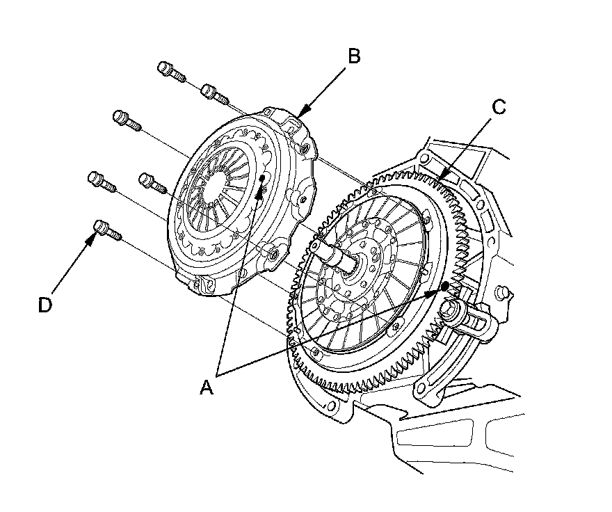 27. Torque the mounting bolts (A) in a crisscross pattern. Tighten the bolts in several steps to prevent warping the diaphragm spring. Make sure that there is not clearance between the pressure plate and the flywheel.