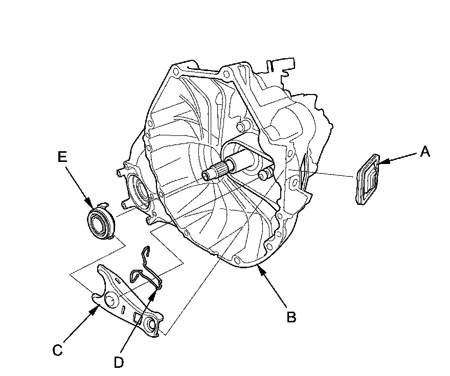3. Remove the release fork (C) from the clutch housing by squeezing the release fork set spring (D). Remove the release bearing (E).