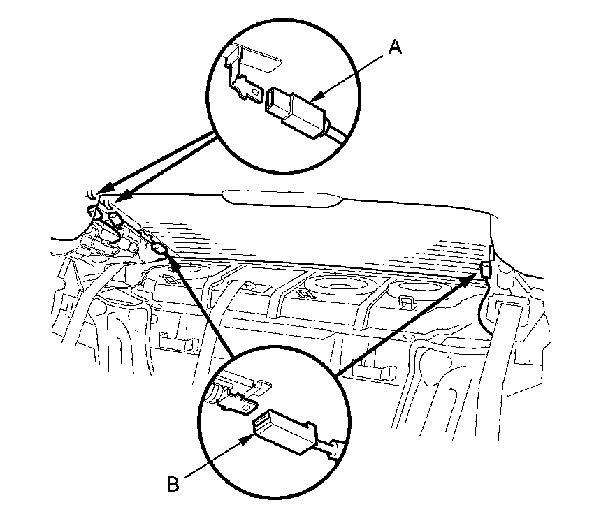 2. Disconnect the window antenna connectors (A) and the rear window defogger connectors (B).