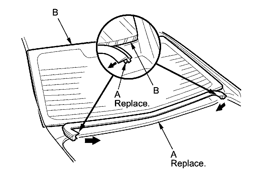 6. Remove the lower rubber dam (A) from the lower edge of the rear window (B). If necessary, cut the rubber dam with a utility knife.