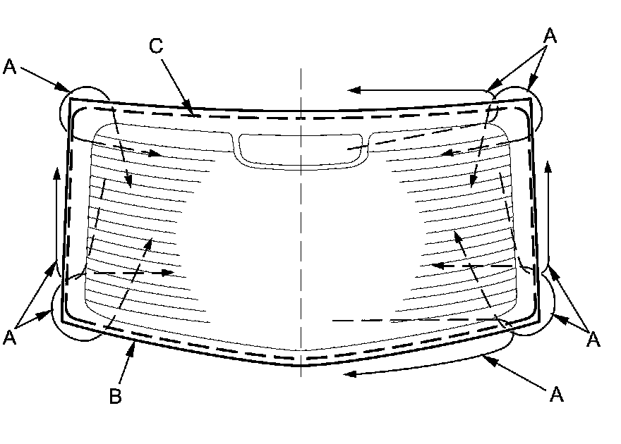 7. With a helper on the outside, pull the piano wire (A) back and forth in a sawing motion. Hold the piano wire as close to the rear window (B) as possible to prevent damage to the body, and carefully cut through the adhesive (C) around the entire rear window.