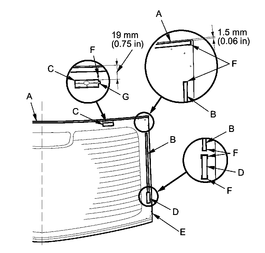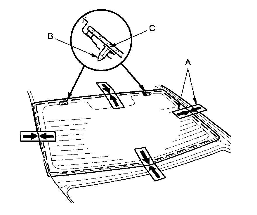 15. Set the rear window in the opening, and center it. Make alignment marks (A) across the rear window and the body with a grease pencil at the four points shown. Make sure the pins (B) of both upper clips (C) contact with the edge of the body holes. Be careful not to touch the rear window where the adhesive will be applied.