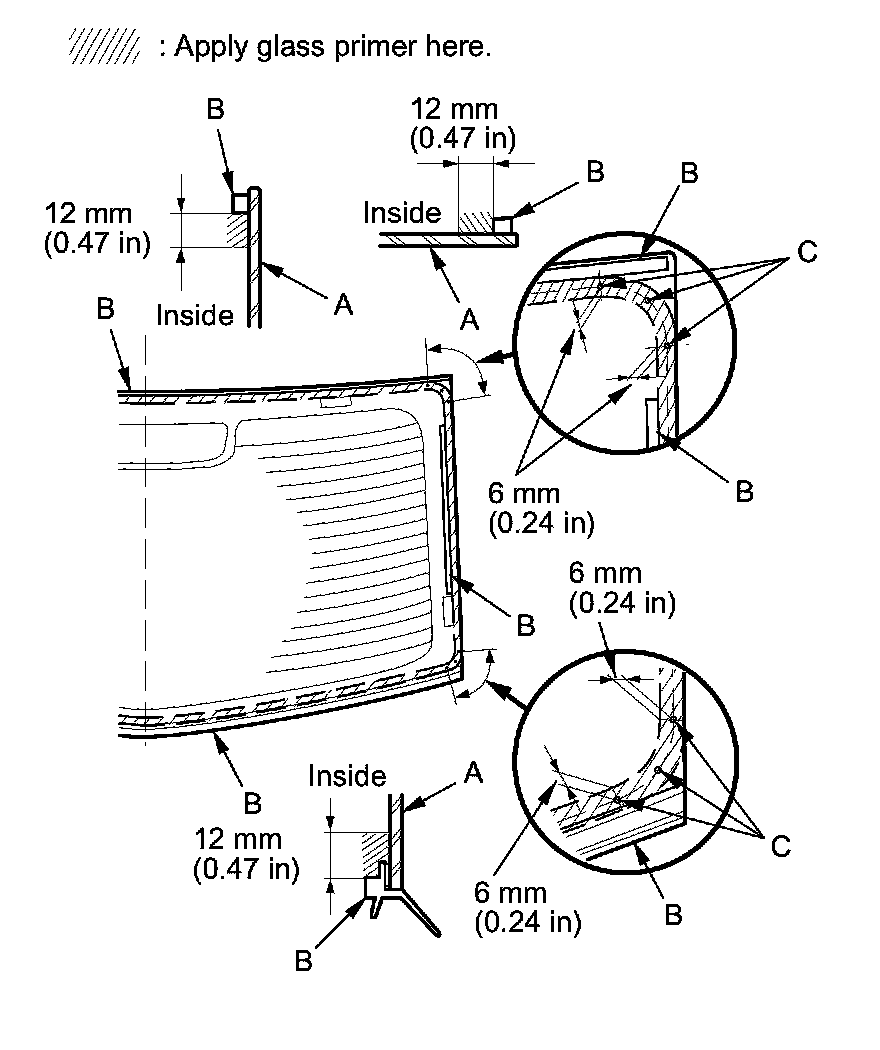 - Apply the glass primer to the corner areas of the rear window using the printed dots (C) on the rear window as a guide.
