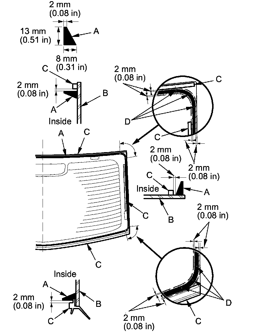 20. Put the cartridge in a caulking gun, and run a continuous bead of the adhesive (A) to the rear window (B) along the edge of the rubber dams (C) as shown: