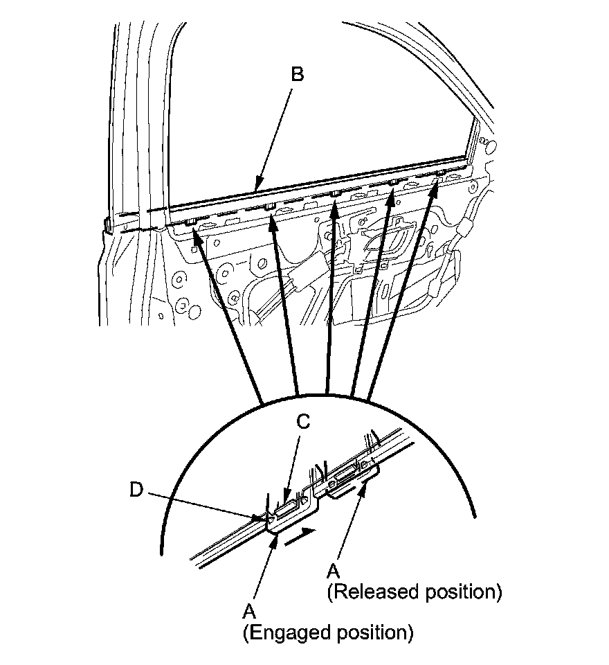 3. From the inside of the door, slide the clips (A) on the door glass outer weatherstrip (B) to release the hooks (C) from the flanges (D) on the door .