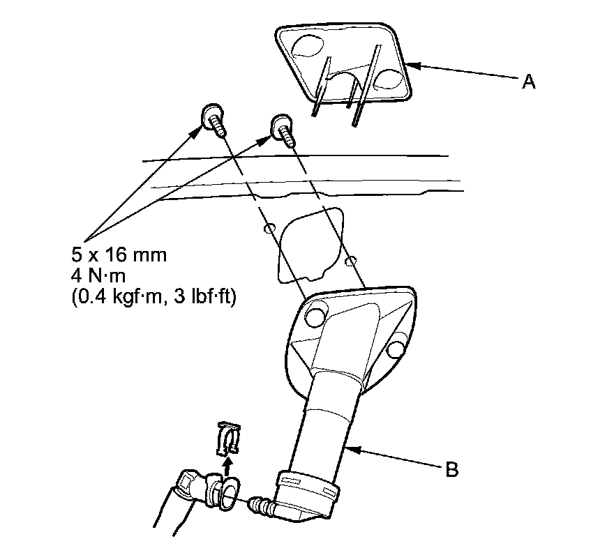 2. Remove the cover (A), tube, mounting screws and headlight washer nozzles (B).