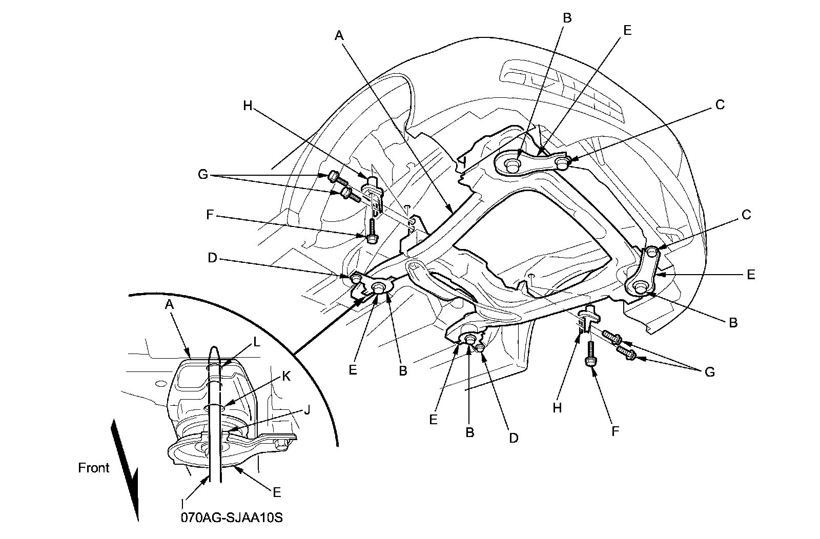 2. Loosely install the new subframe middle mounting bolts (F, G) securing the subframe middle mounts (H).