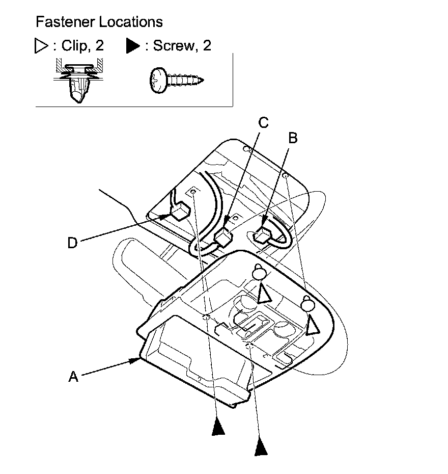 2. Disconnect the roof console connector (B), the moonroof switch connector (C), and the HFL microphone connector (D) (for some models).