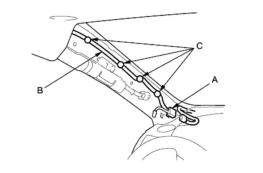 6. Driver's side: Disconnect the roof wire harness connector (A), and remove the roof wire harness (B) from the A-pillar by detaching the harness clips (C).