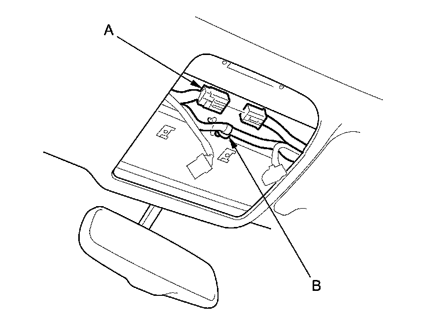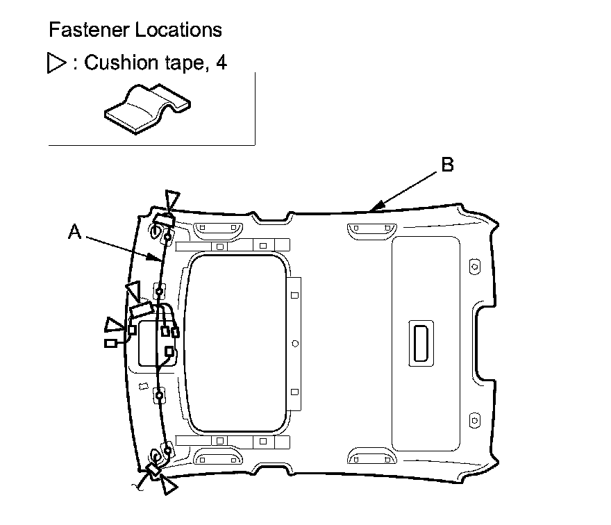 10. If necessary, remove the cushion tapes fastening the roof wire harness (A) to the headliner (B), then remove the harness from the headliner.