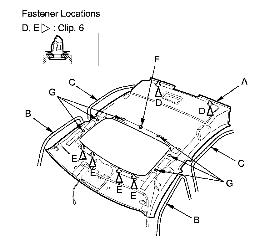 3. Detach the front clips (E), the magnet (F), and the Velcro fasteners (G) by pulling the headliner down at the moonroof opening.