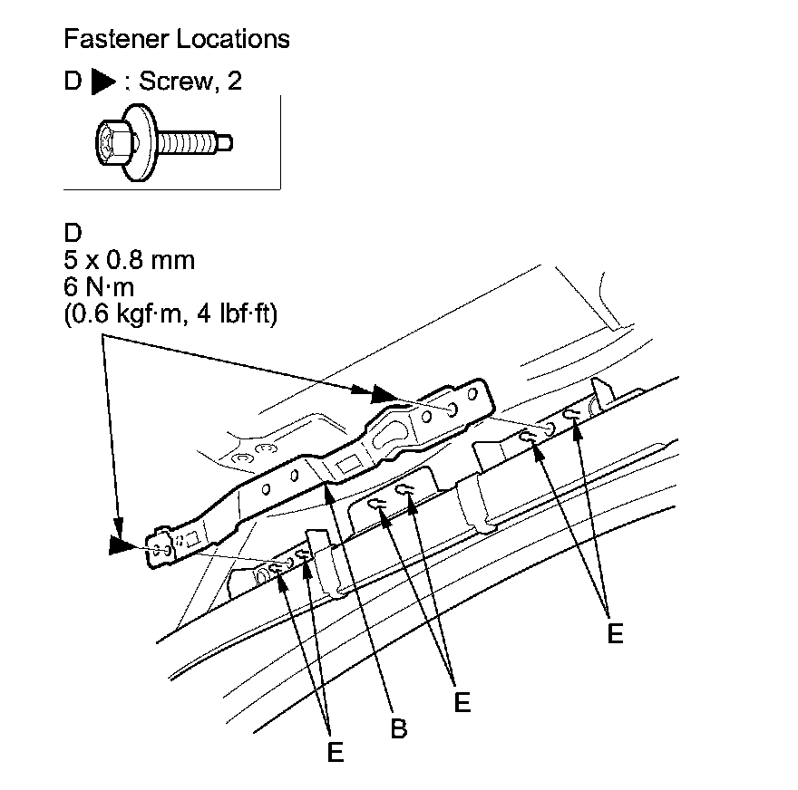 2. Release the tabs (E) holding the grab handle bracket to the side curtain airbag, and remove the bracket.