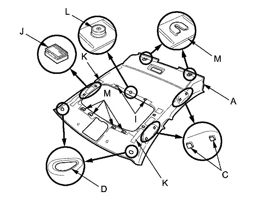 - Any fastener bases (J), stiffeners (K), magnet (L), or clip bases (M) which have come off the headliner