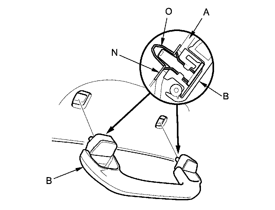 - When installing the grab handle, push on the handle against the bracket (N) until the clips (O) snap into place securely.