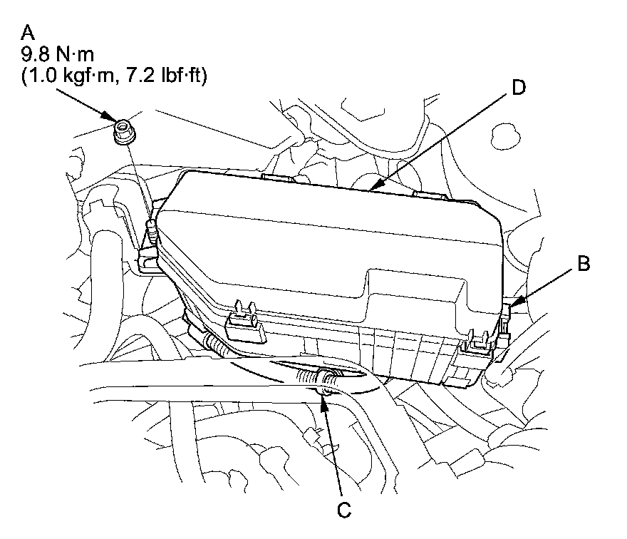 4. Remove the harness clamp (C), then move the under-hood fuse/relay box (D) aside.