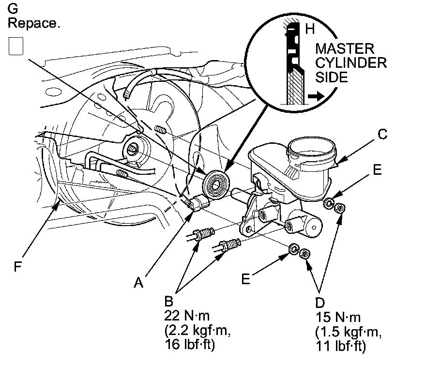 9. Remove the master cylinder from the brake booster (F). Be careful not to bend or damage the brake lines when removing the master cylinder.