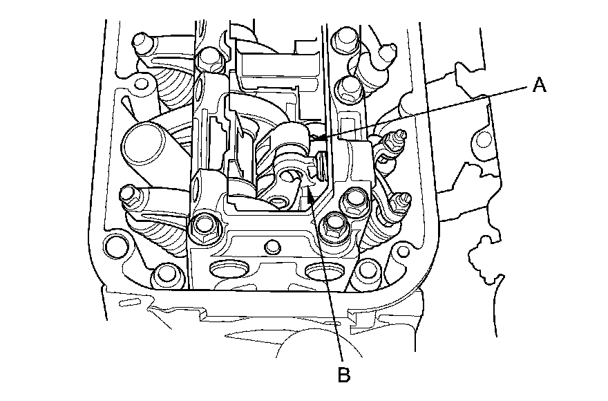 10. With the specified air pressure applied, rotate the crankshaft pulley clockwise, and visually check all the intake primary rocker arms (A) and the intake secondary rocker arms (B) move together.