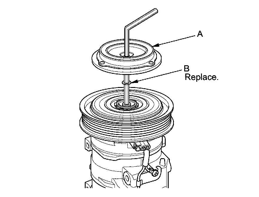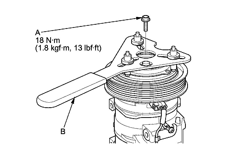 1. Remove the center bolt (A) while holding the pressure plate with a commercially available A/C clutch holder (B).