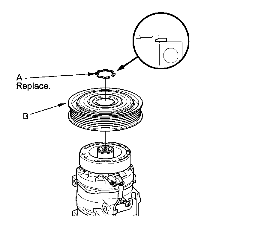 3. If you are replacing the field coil, remove the snap ring (A) with snap ring pliers, then remove the pulley (B). Be careful not to damage the pulley or the A/C compressor.