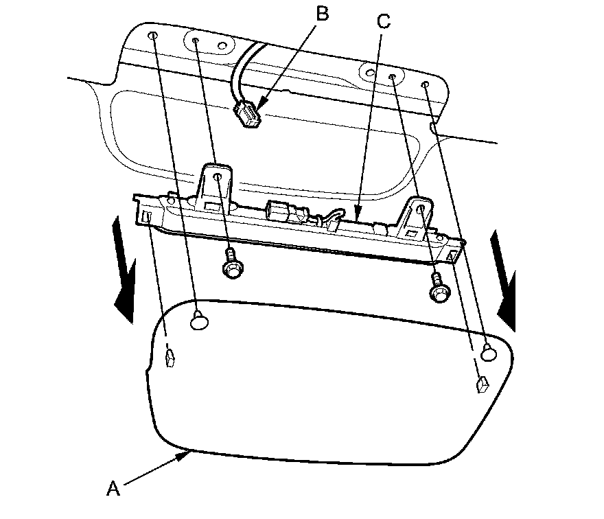 1. Remove the high mount brake light cover (A) by pulling straight down on the cover to release the clips.