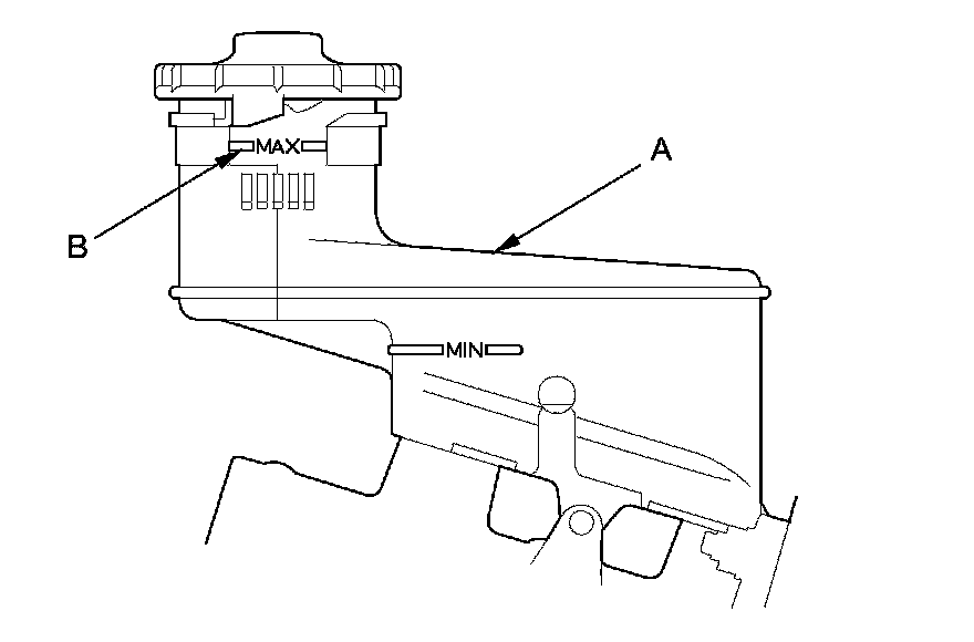 1. Make sure the brake fluid level in the reservoir (A) is at the MAX (upper) level line (B).