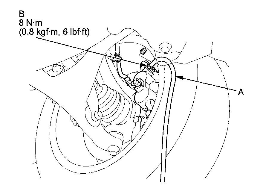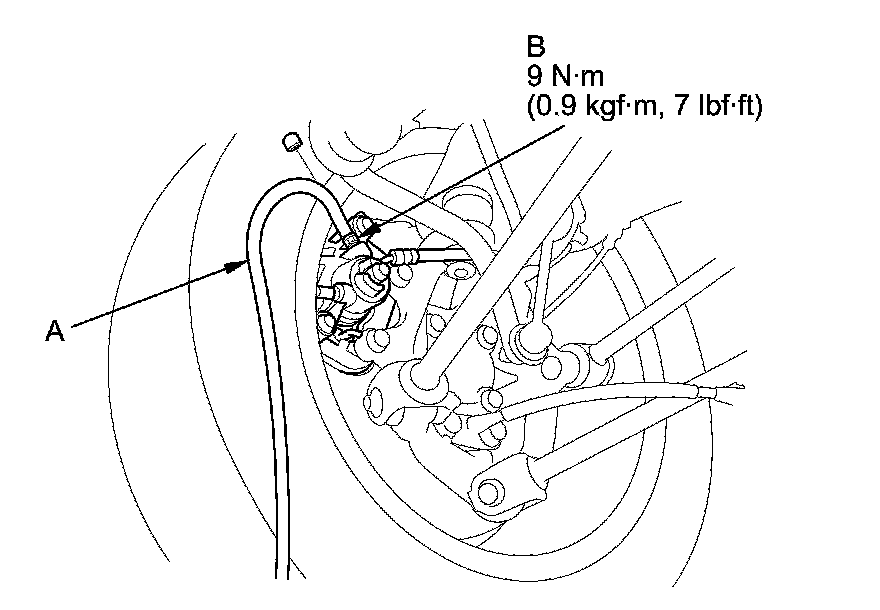 4. Attach a length of clear drain tube (A) to the bleed screw (B), then loosen the bleed screw to allow air to escape from the system. Then tighten the bleed screw securely.